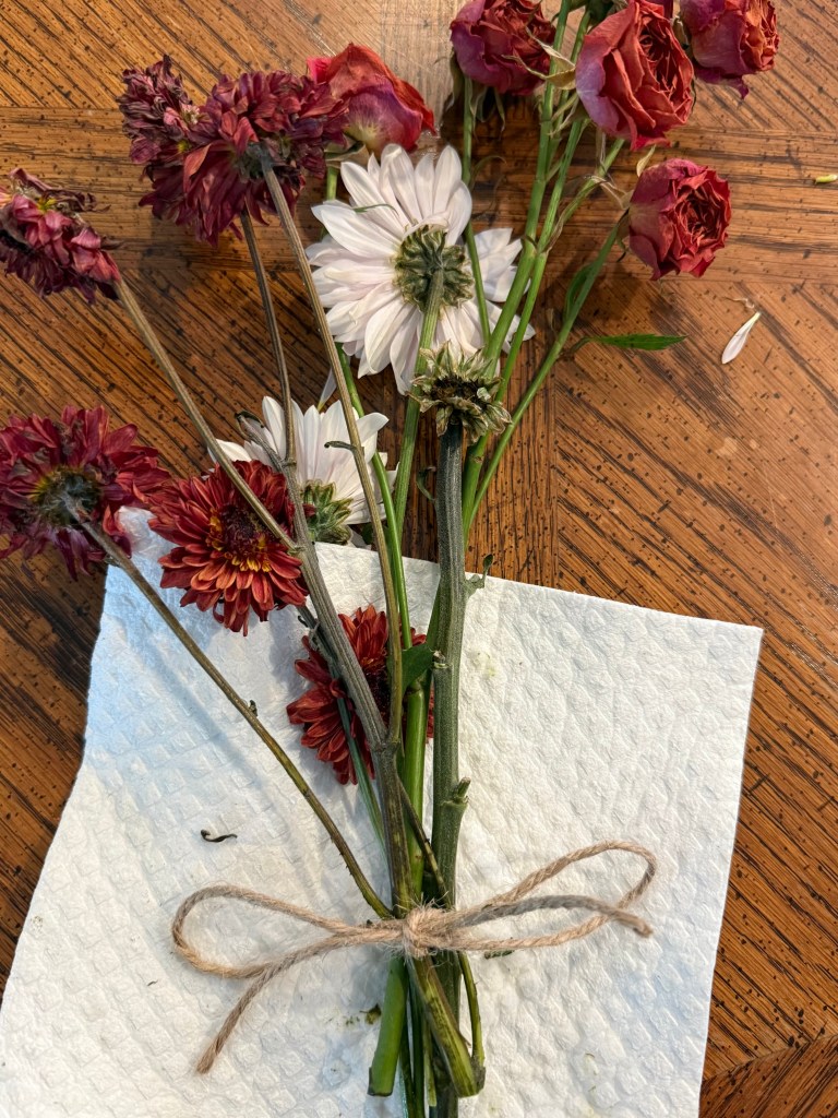 At our 6 year anniversary brunch date my hubby surprised me with these gorgeous blooms from a local vendor cart (I had thought he was in the loo) and I absolutely loved them! But after a week in the kitchen table vase, they started to wilt of course. Thus began my flower drying journey.